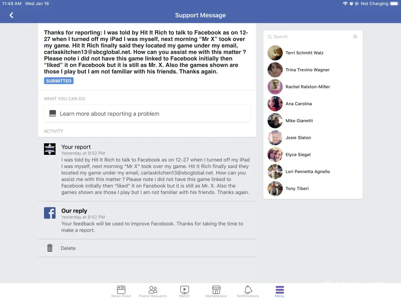 On 12-27 when I turned off my IPad I was myself. Next day when I turned on I was Mr X, had my games listed but I did not know his friends. I have diligently gotten points for him (dummy me) and he has gone from $10, 000, 000. To $131, 000, 000. I have talked many times a week with HIR technology. Then they said go to Facebook which I sent screen print to HIR, 2 days ago they were consulting with someone in games. Now technology all changed. I WANT MYSELF, MY POINTS AND MY 136 status or so standing back, THATS IT ! They were able to find myself, why can't this be resolved ? Screen print below is Mr X