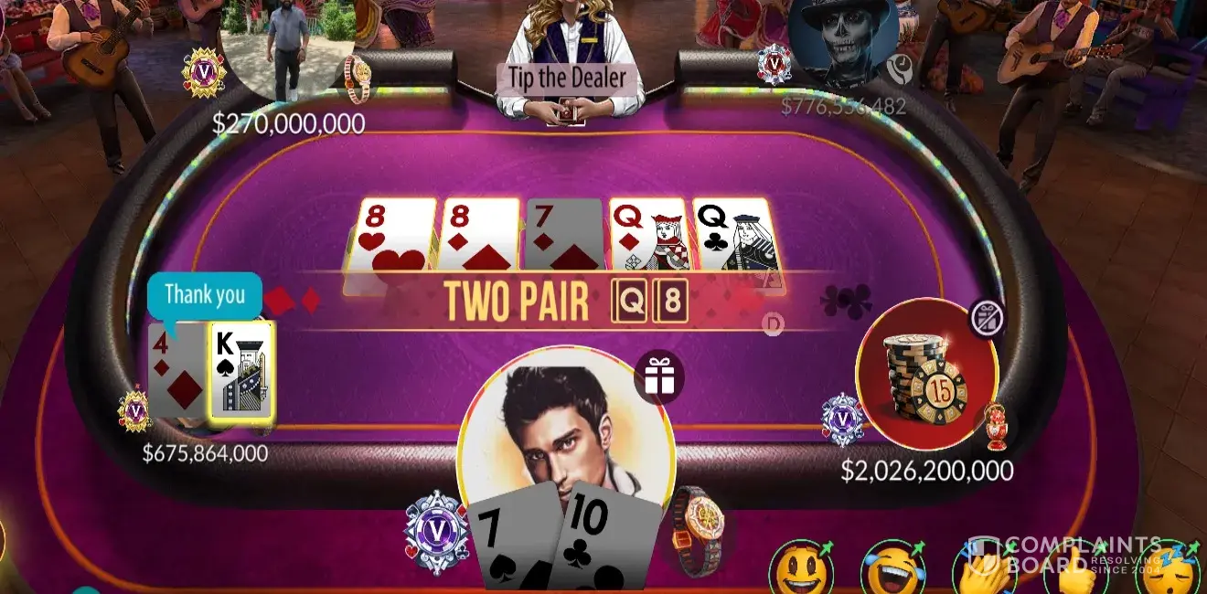 On May 7th I submitted a complaint to zynga support regarding my purchase of chips worth more than 150 euros. The problem was that I could not win after that as if I was playing against bots even though I had a stronger hand.