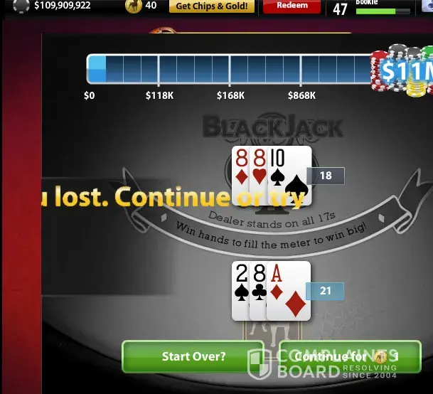 This makes four times, that I have been ripped off, just within the last 3 weeks. I complained to zynga on facebook, and they did nothing. I spent money to buy gold, and win chips. I played blackjack... 21 blackjack is the game I played, and when I win, it says sorry you lose, do you want to start over. I stupidly deleted the other screenshot, because I mistakenly thought the only place I could complain was on facebook. twice was where it froze, and I had to start over and again twice this has happened where I won but it said I lost I honestly, expect to be reimbursed. see for yourself. the one where it doesn't say anything is where it froze. the other you can clearly see, I was ripped off.