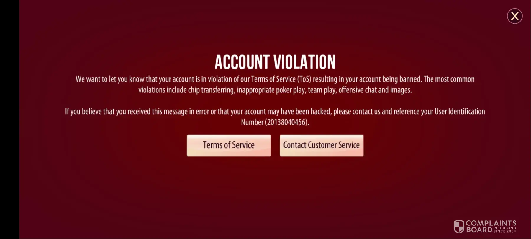 Desired outcome: I want my chips and gold to be intact when my account is given back, I do not want to be flagged by Zynga as someone who chip shares or violates the polices. I also want Zynga to legally have to provide hard evidence of people who do this.