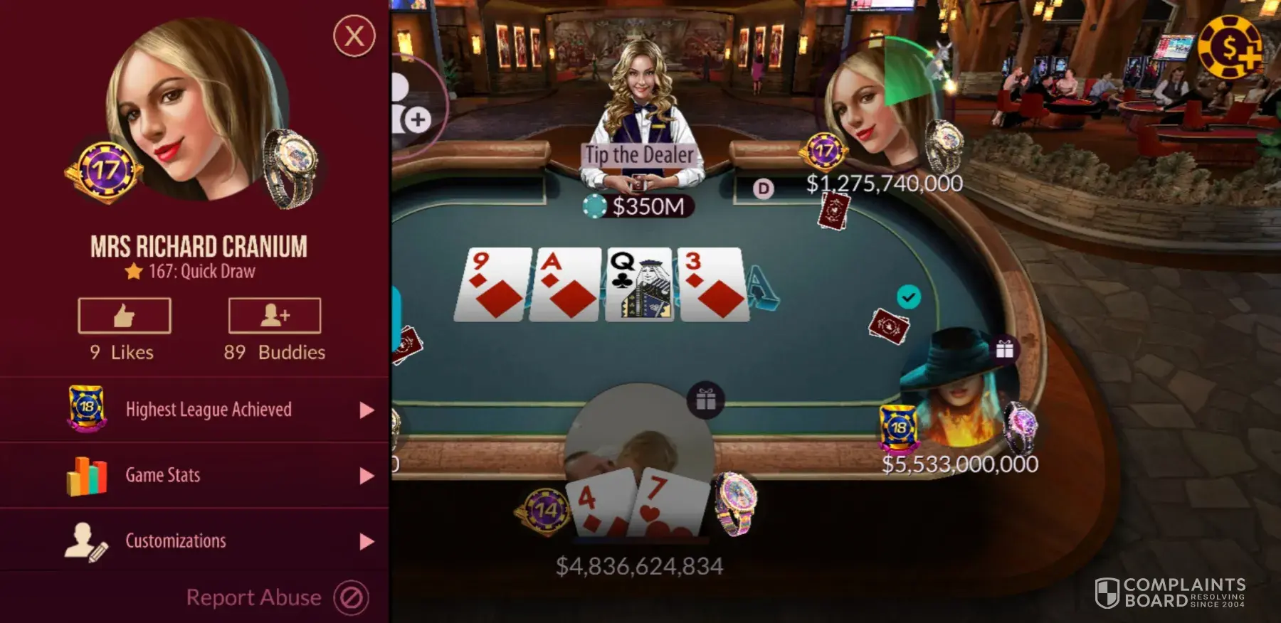 Zynga is not right. There is no way I should lose 90% of the time being ahead in the hand on the turn card. I have a name for this getting Zynga. I complained about this early survey until they stopped asking. It appears to me that you have geared this game for the fish that don't know how to play. You need to get this fixed to make it fair. So not just the stupid players will win. I know I will be looking for a new place to spend my time playing.