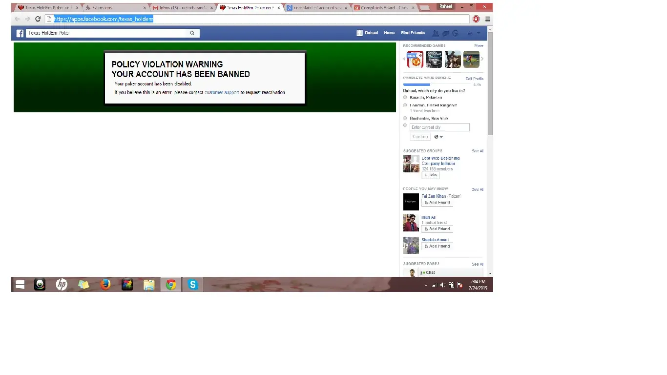 hi this is kadri nadim from india, i was palying zynga poker on facebook, & i been cheated by zynga poker, i had buy 180, 000, 000/-chips from my credit card, 9 july its cost me 250$, and then i was plying then i win 212, 000, 000/- i had in the end, i never transfer any chips to any1, but on 5aug 2011, but now i got some green page, saying me that my account have been suspended. so i need want to take some action on zynga poker guys,